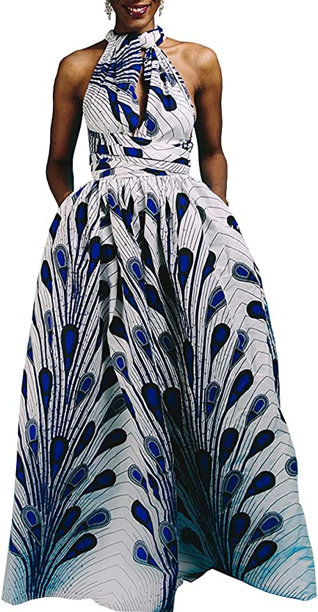 Robe Imprimée Wax Grande Taille Afrique Plume Bleue