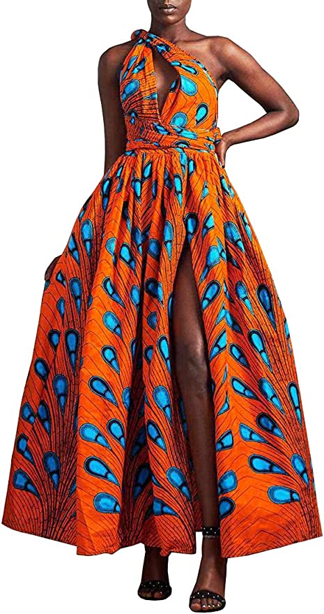 Robe Imprimée Wax Grande Taille Afrique Plume Bleue fond Orange